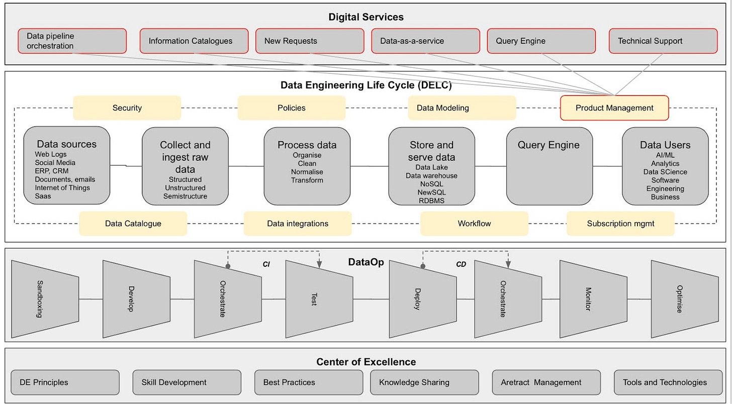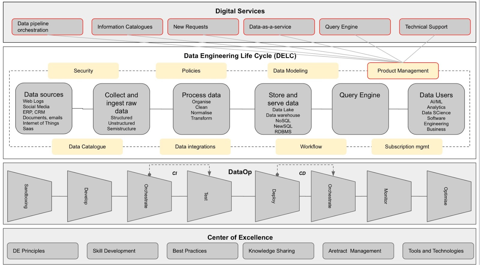 The Data Engineering Framework is composed of 4 critical tiers. i ) the Digital Services tier which describes the digital services ii) the operational tier which describes the stages and steps of DELC , iii) the methodology tier to describe the DELC delivery mechanism through adoption of Agile Software Engineering, DevOP, Platform Engineering and Chaos Engineering; and lastly iv) the Center Of Excellence tier which maximises and speeds applications of learnings and findings extracted from day to day operation.